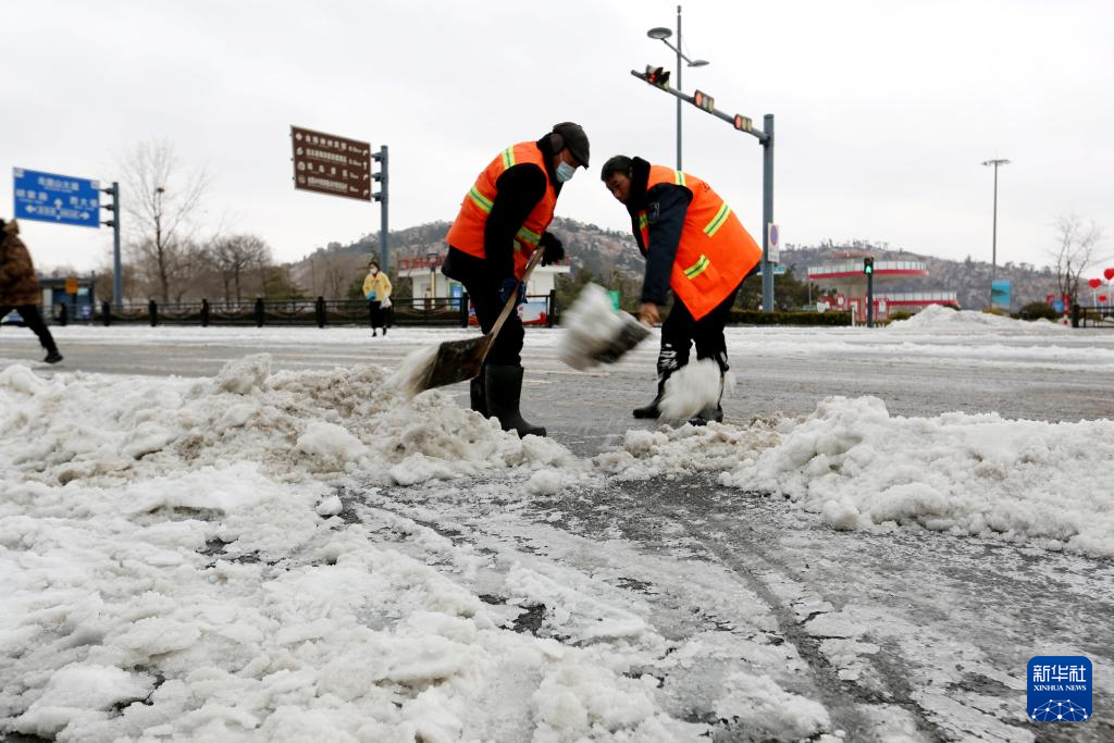 2月21日,在江苏省连云港市连云区道路上,环卫工人在路面上清理积雪。新华社发(王春摄)