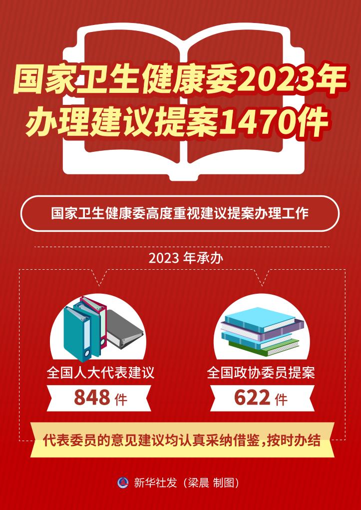 新华社北京2月29日电(记者李恒、董瑞丰)国家卫生健康委副主任李斌29日表示,国家卫生健康委高度重视建议提案办理工作,2023年承办全国人大代表建议848件,全国政协委员提案622件,代表委员的意见建议均认真采纳借鉴,按时办结。