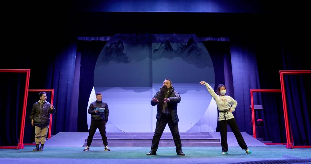2024年2月21日,全国政协委员陈智林(左三)在四川省川剧院排练川剧《梦回东坡》。新华社发