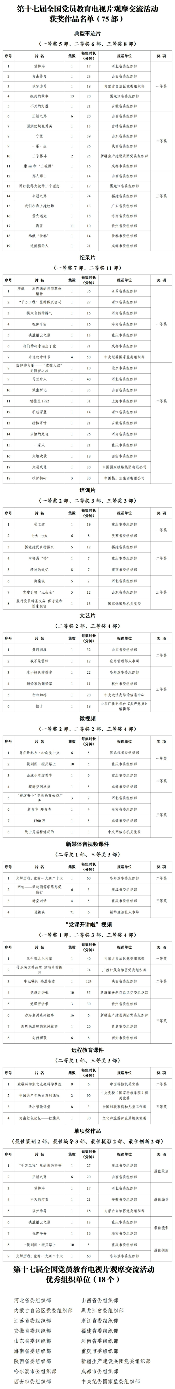 省(区、市)党委组织部,副省级城市党委组织部,中央和国家机关部委、人民团体组织人事部门,新疆生产建设兵团党委组织部,中管金融企业党委,国有重要骨干企业党组(党委),高等学校党委等177家单位选送了1293部作品。主办方严格按照评审标准和程序,组织了初审筛选、评委评审、大数据校核、复核把关等,最终评选出75部获奖作品(一等奖17部、二等奖29部、三等奖29部,并从中确定单项奖作品9部)、18个优秀组织单位。获奖作品将陆续在共产党员网、共产党员微信、全国远程教育专用频道等展播。