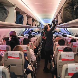 2月5日,国产大飞机C919执飞的东航航班上,乘务员正为旅客放置行李。今年是国产大飞机C919首次服务春运。新华社记者 王聿昊 摄