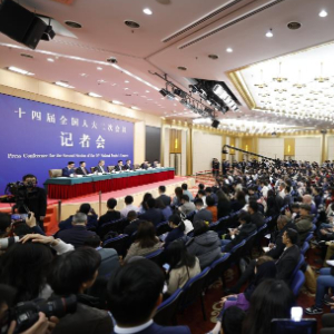 3月6日,十四届全国人大二次会议在北京梅地亚中心新闻发布厅举行记者会。国家发展和改革委员会主任郑栅洁、财政部部长蓝佛安、商务部部长王文涛、中国人民银行行长潘功胜、中国证券监督管理委员会主席吴清就发展改革、财政预算、商务、金融证券等相关问题回答中外记者提问。这是新华社记者在提问。