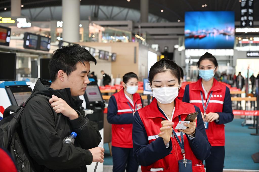 1月26日,青年志愿者在青岛胶东国际机场为旅客提供指引服务。新华社记者 李紫恒 摄