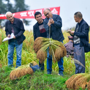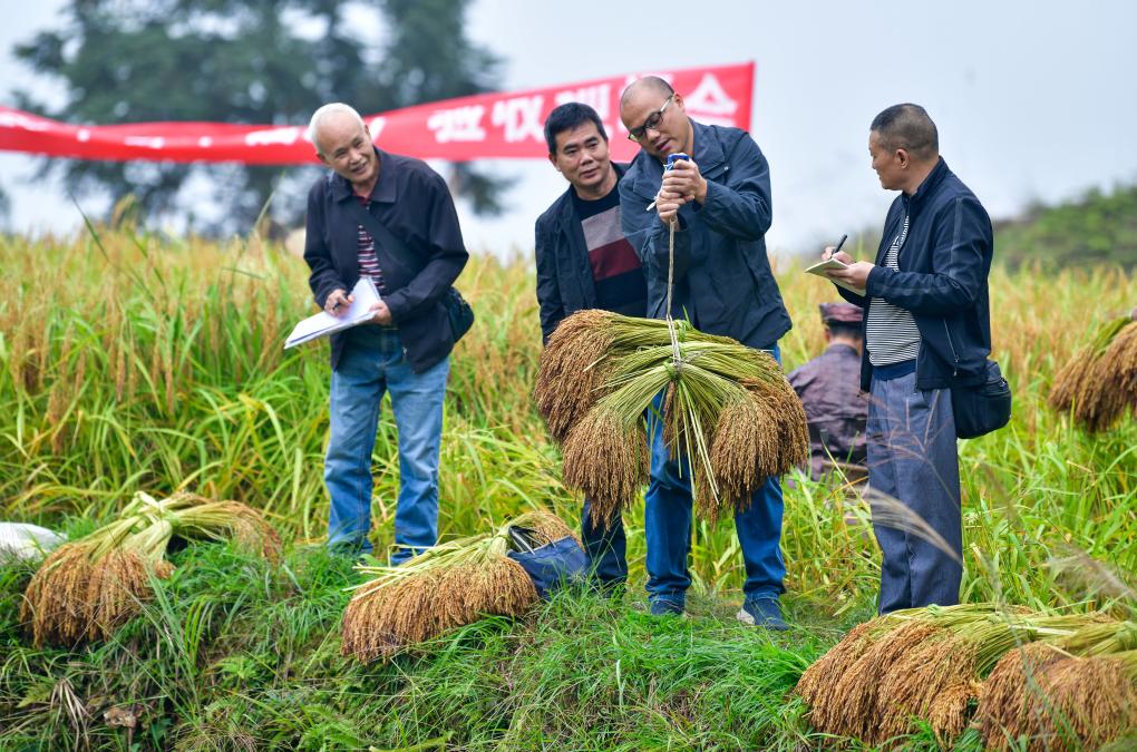 2023年10月11日,农技人员在贵州省从江县高增乡建华村现场测产香禾糯稻谷。新华社记者 杨文斌 摄