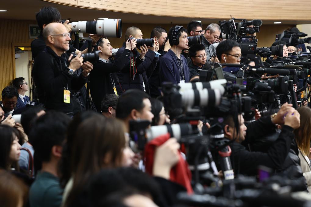 3月7日,十四届全国人大二次会议在北京梅地亚中心新闻发布厅举行记者会。中共中央政治局委员、外交部长王毅就中国外交政策和对外关系相关问题回答中外记者提问。这是记者在现场采访。