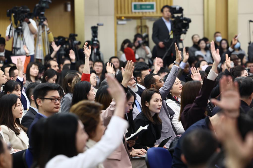 3月7日,十四届全国人大二次会议在北京梅地亚中心新闻发布厅举行记者会。中共中央政治局委员、外交部长王毅就中国外交政策和对外关系相关问题回答中外记者提问。这是记者在举手提问。