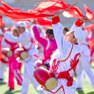 2023年11月16日,内蒙古鄂尔多斯市鄂托克前旗第二小学的学生在大课间表演安塞腰鼓。 新华社发(王正摄)