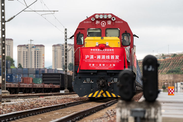 这是2023年10月8日在云南省昆明市王家营西站拍摄的“沪滇·澜湄线”国际货运班列开行首发仪式一景。新华社记者 胡超 摄