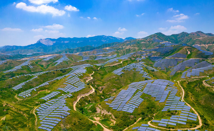2023年7月18日,在山西省运城市稷山县100MW光储一体化项目基地,一排排整齐的光伏板与远处的青山交相辉映。近年来,稷山县因地制宜流转荒山荒坡发展光伏产业,增加农民收入,助力乡村振兴。(山西省委办公厅 供图)