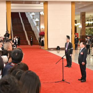 3月8日,第十四届全国人民代表大会第二次会议第二场“部长通道”集中采访活动在北京人民大会堂举行。这是工业和信息化部部长金壮龙向记者挥手致意。