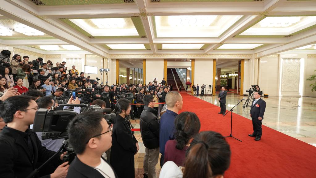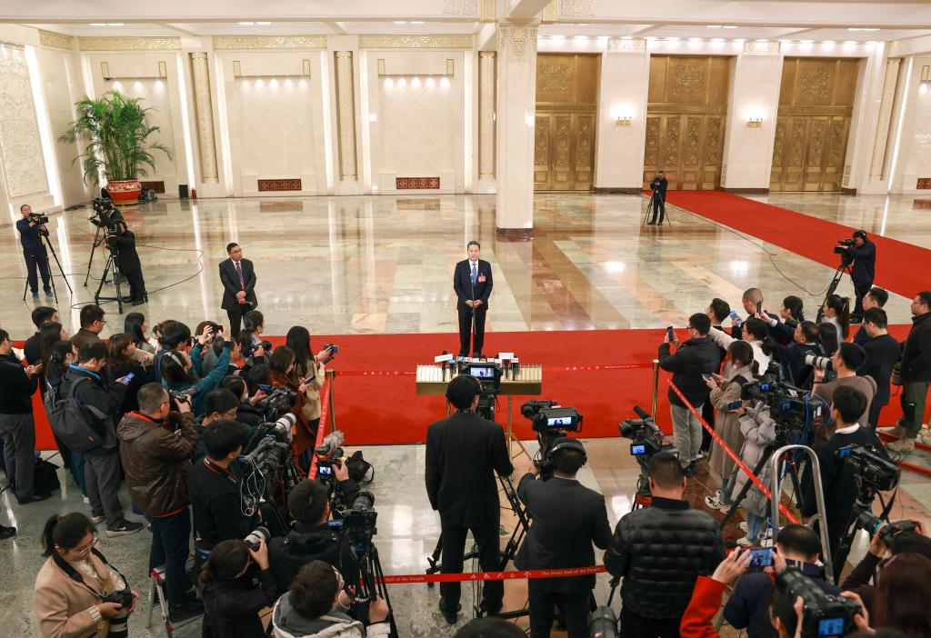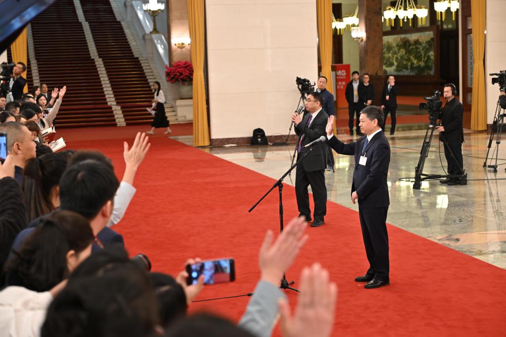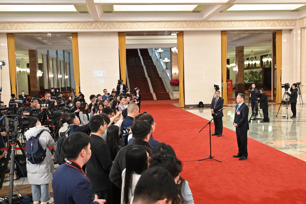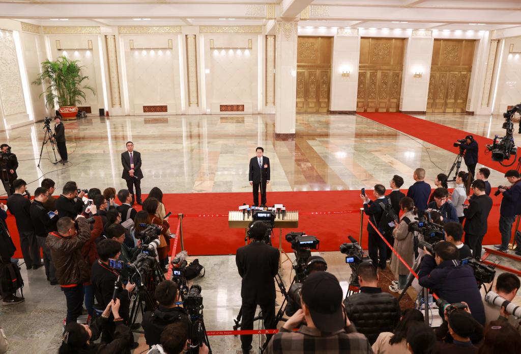 3月8日,第十四届全国人民代表大会第二次会议第二场“部长通道”集中采访活动在北京人民大会堂举行。这是记者在现场采访。