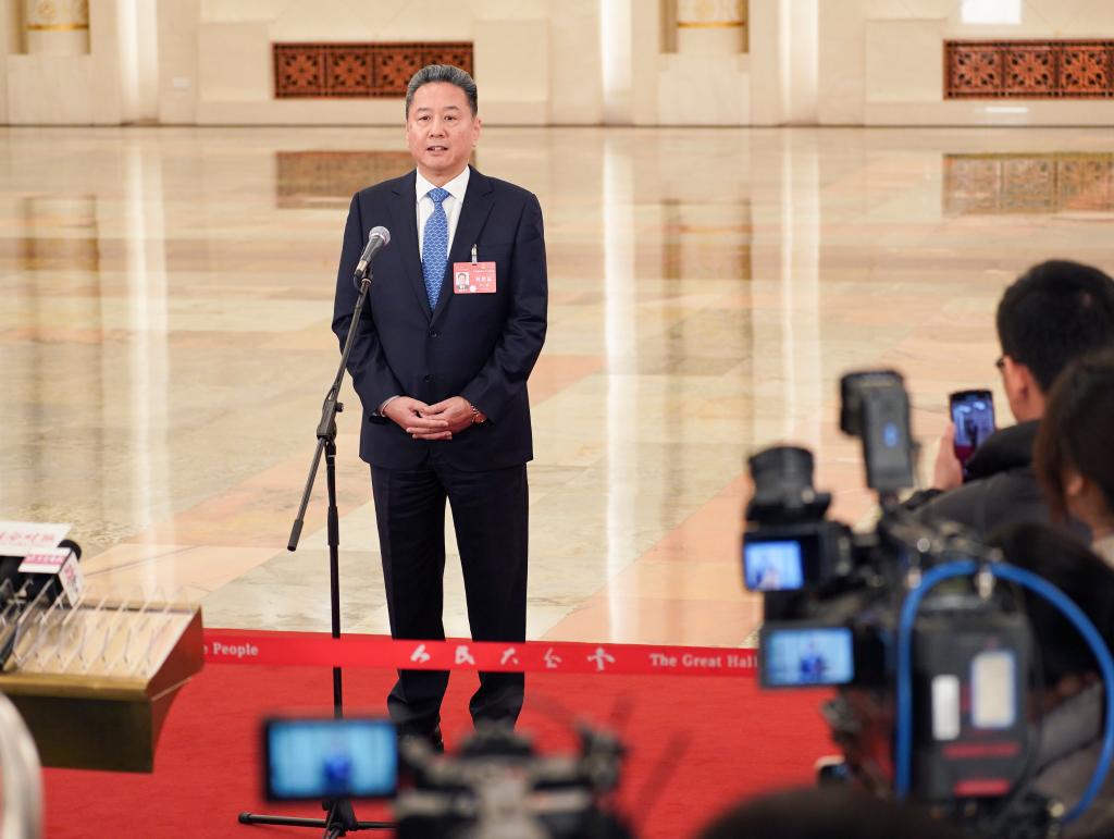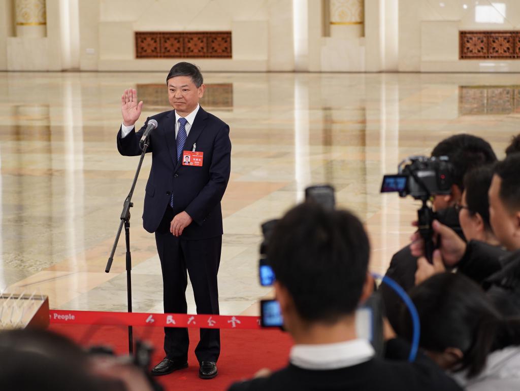 3月8日,第十四届全国人民代表大会第二次会议第二场“部长通道”集中采访活动在北京人民大会堂举行。这是生态环境部部长黄润秋接受媒体采访。