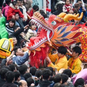 2月12日,在南昌市西湖区万寿宫历史文化街区,游客与板凳龙演员互动。新华社发(鲍赣生摄)