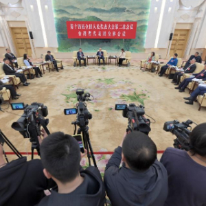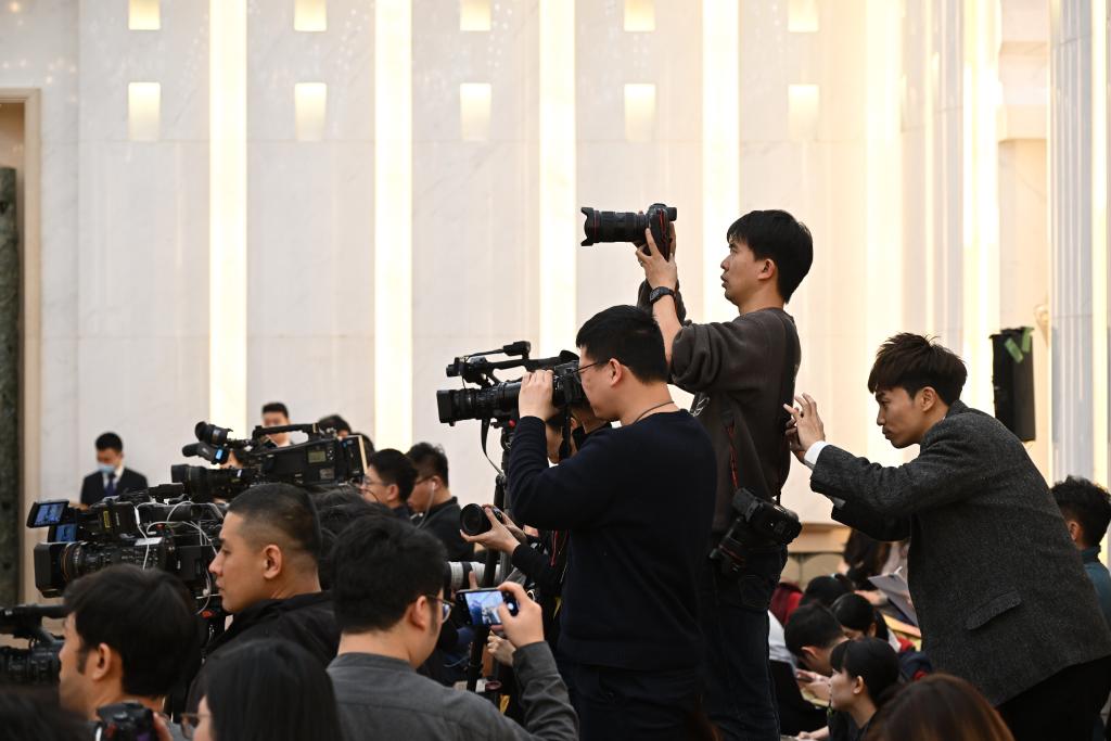 3月9日,十四届全国人大二次会议台湾代表团举行开放团组会议。这是记者在会议现场采访。