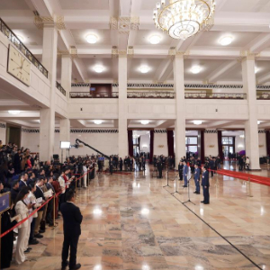 3月10日,全国政协十四届二次会议第三场“委员通道”集体采访活动在北京人民大会堂举行。这是记者举手提问。