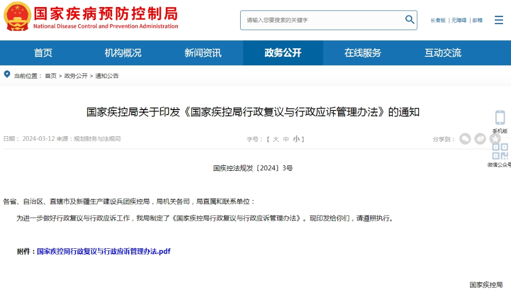 新华社北京3月13日电(记者顾天成)国家疾控局近日印发《国家疾控局行政复议与行政应诉管理办法》,旨在规范国家疾控局的行政复议和行政应诉工作,依法办理行政复议和行政应诉事项,切实保护公民、法人和其他组织的合法权益,推进法治政府建设。