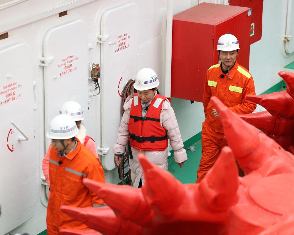 田会静(中)在“天鲸号”上对疏浚设备及施工工艺进行调研。