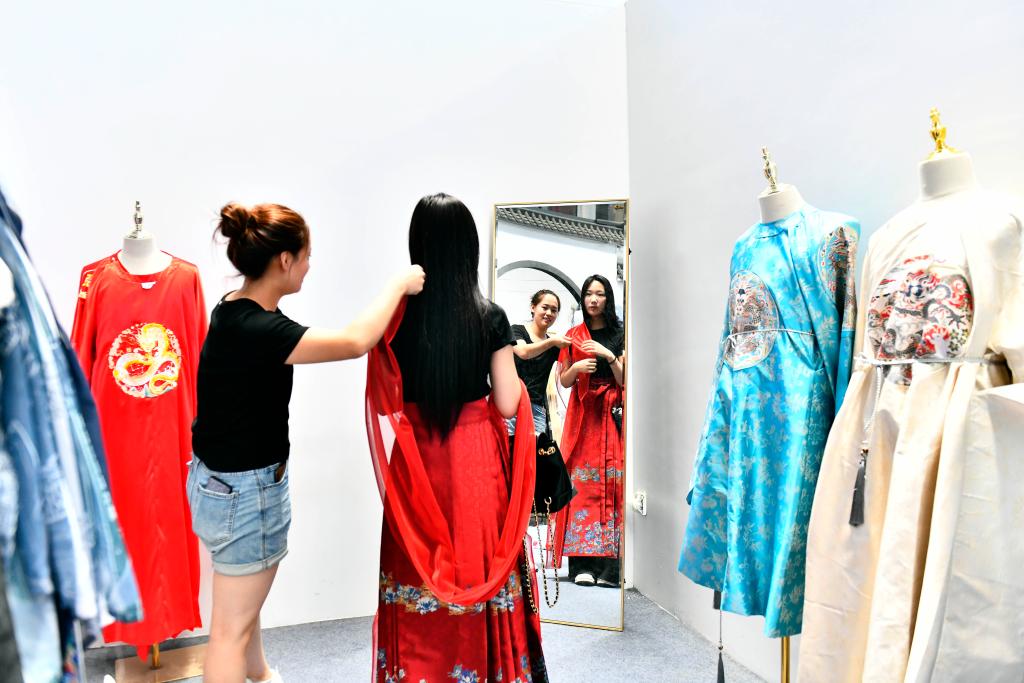 2023年7月6日,顾客在山东曹县某服饰公司试穿马面裙。新华社记者郭绪雷摄