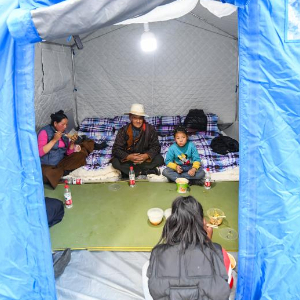 3月17日,在四川省雅江县城关第一完全小学安置点,受灾群众正在吃晚饭。新华社记者 王曦 摄
