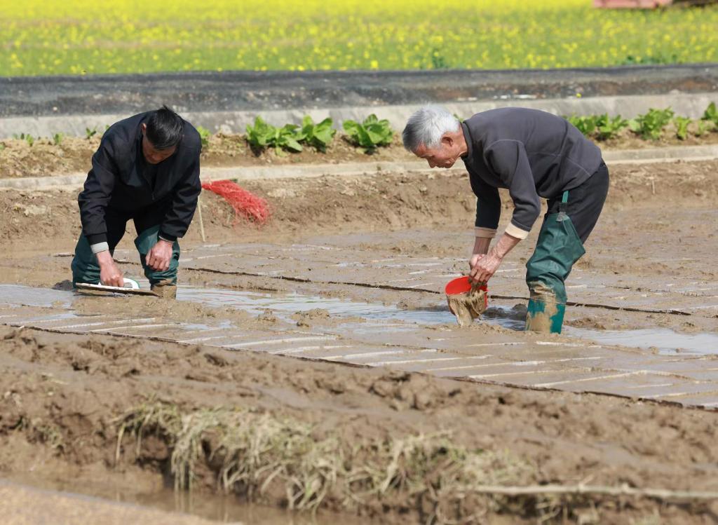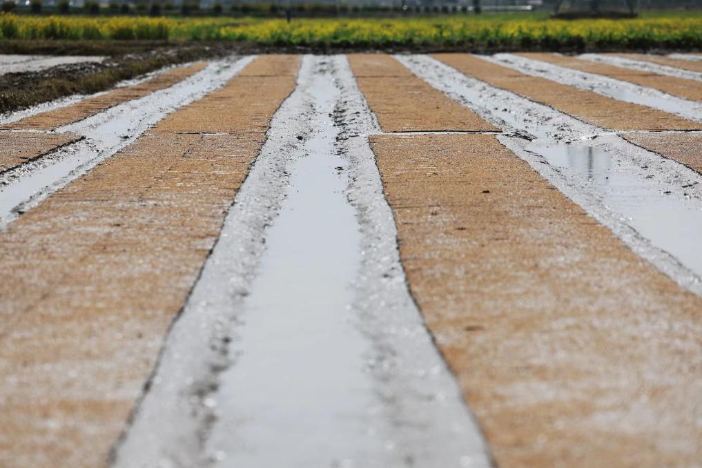 在道路另一侧的秧田,装满稻种的秧盘已经铺在一垄垄“秧床”上。为了保障秧苗后期的茁壮成长,过几天,农民还会用地膜为它们搭建好“房子”。