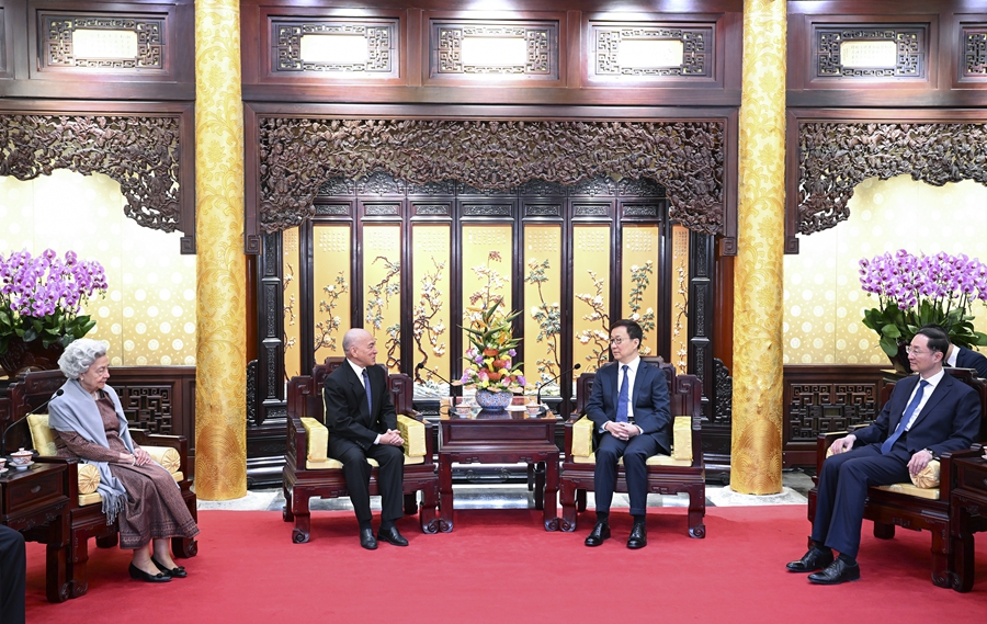 3月21日,国家副主席韩正在北京会见柬埔寨国王西哈莫尼和太后莫尼列。