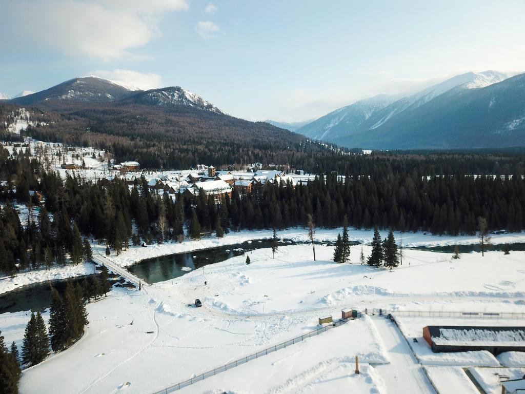 喀纳斯河的冰在慢慢消融,河边的石头上还堆着圆圆的、厚厚的雪,远处看像一朵朵“雪蘑菇”。一座警民连心桥横跨喀纳斯河,一边连接着哈纳斯老村,另一边是一围橙红色的院落,国旗高高地飘在院落中间,这就是新疆阿勒泰边境管理支队喀纳斯边境派出所。