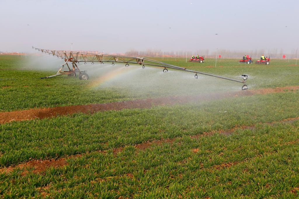 3月14日,在山东省青岛市即墨区蓝村街道,智能喷灌机在麦田里作业。(梁孝鹏 摄)