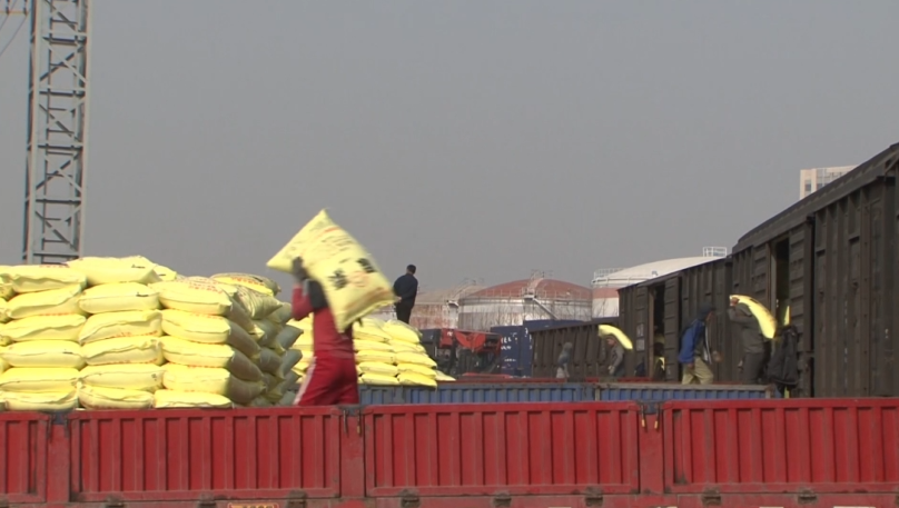 国铁济南局兖州北站工作人员正在装卸化肥。(视频截图)