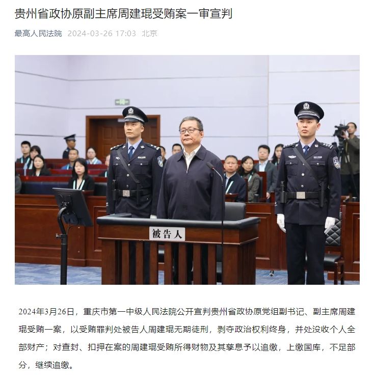 2024年3月26日,重庆市第一中级人民法院公开宣判贵州省政协原党组副书记、副主席周建琨受贿一案,以受贿罪判处被告人周建琨无期徒刑,剥夺政治权利终身,并处没收个人全部财产;对查封、扣押在案的周建琨受贿所得财物及其孳息予以追缴,上缴国库,不足部分,继续追缴。