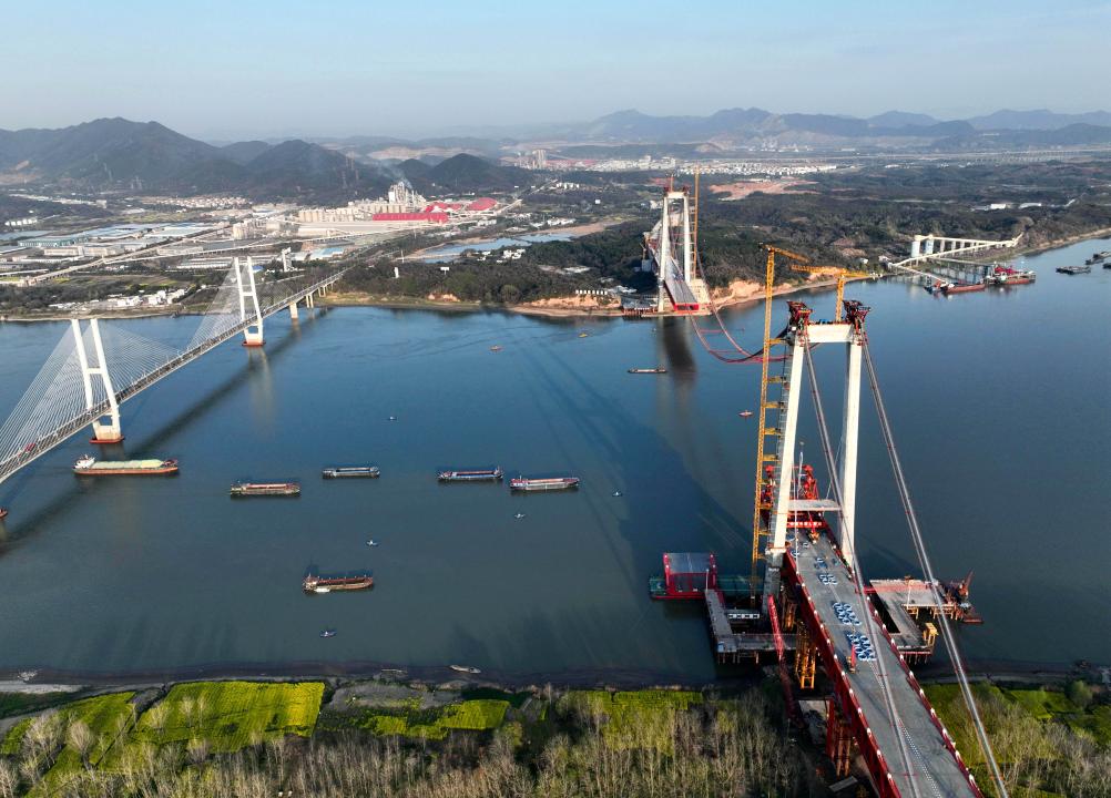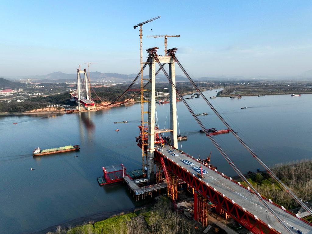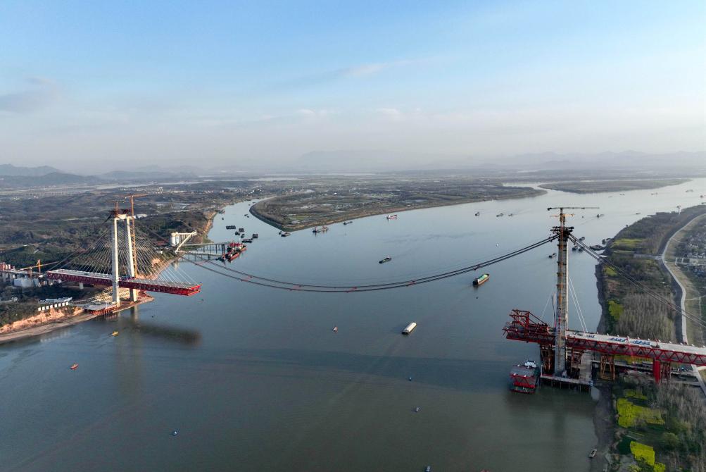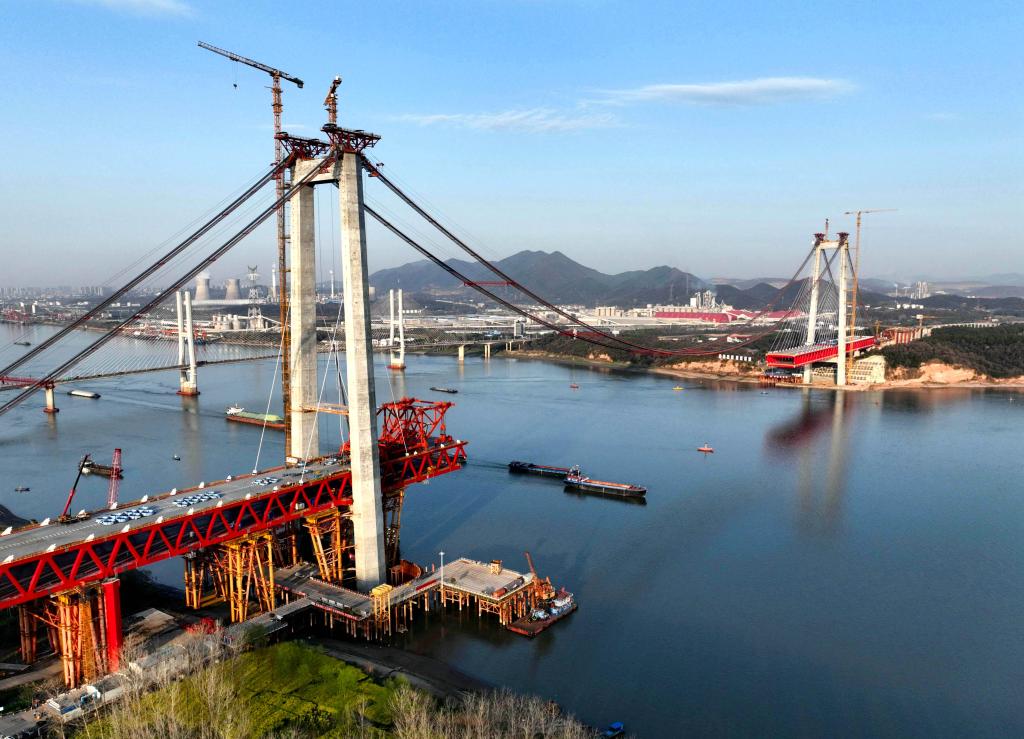 这是建设中的京台高速铜陵长江公铁大桥(3月21日摄,无人机照片)。