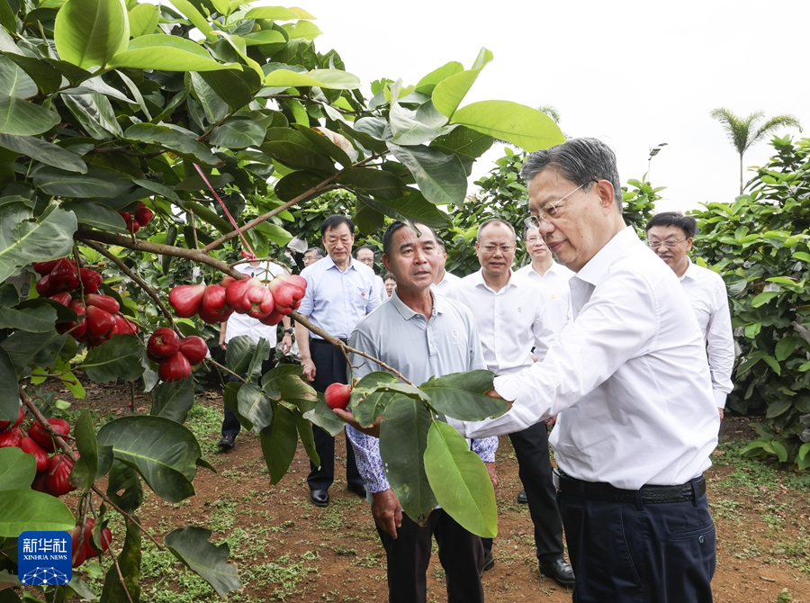 3月29日至30日,中共中央政治局常委、全国人大常委会委员长赵乐际在海南调研。这是3月29日,赵乐际在定安县黄竹镇白塘村,察看莲雾果园种植情况。新华社记者 庞兴雷 摄