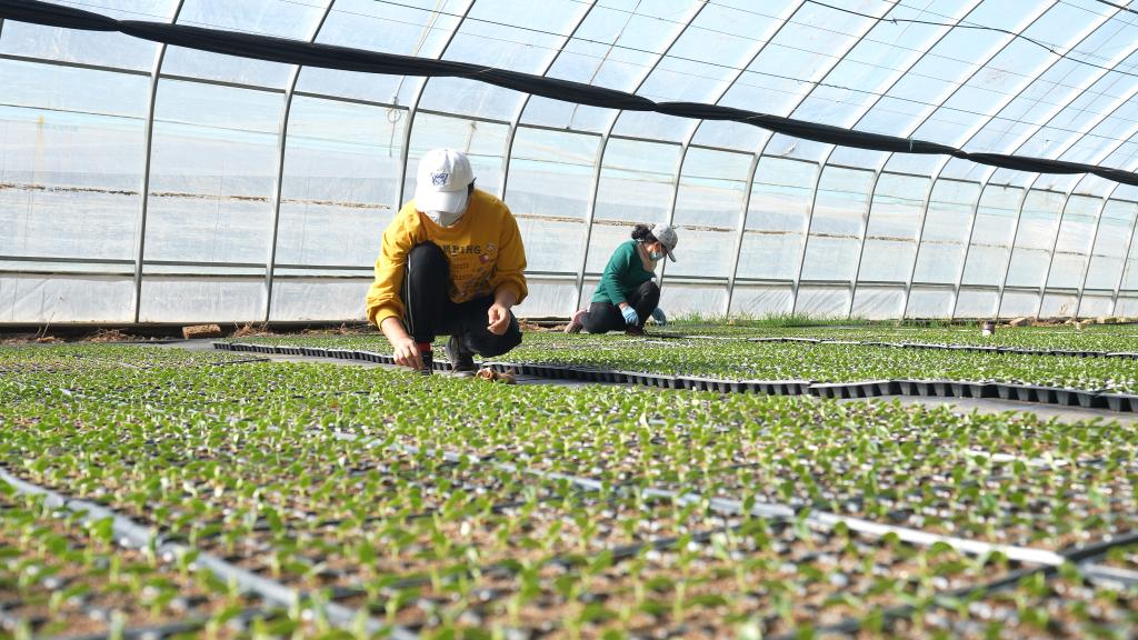 3月29日,土默特左旗农户正在育苗大棚内检查果蔬苗培育情况,对多余杂草进行摘除。(受访者供图)