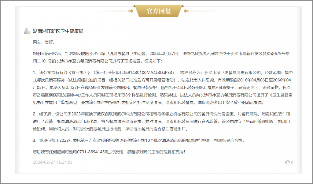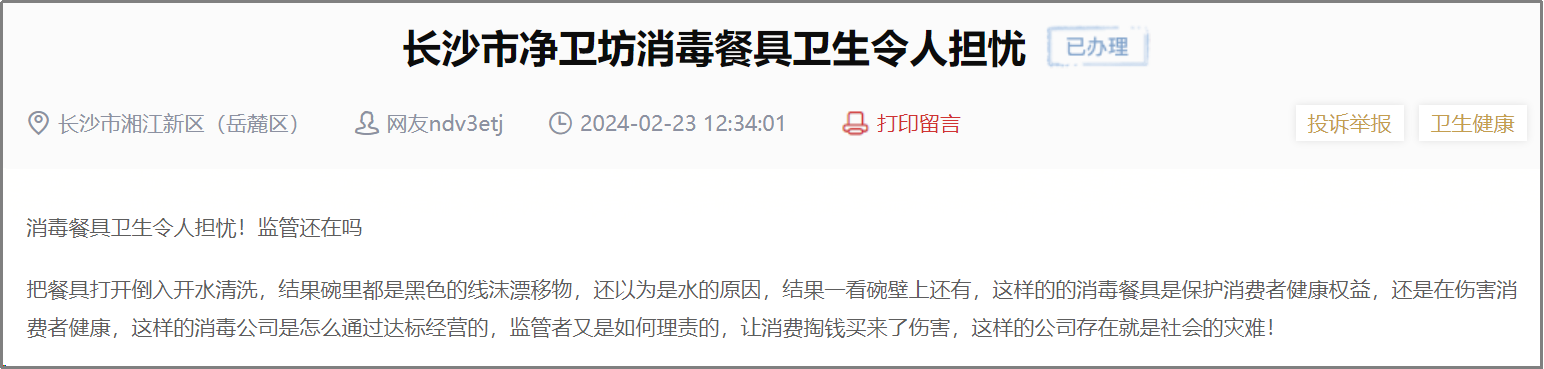 网友针对“净卫坊”餐具不卫生问题的举报及官方回复