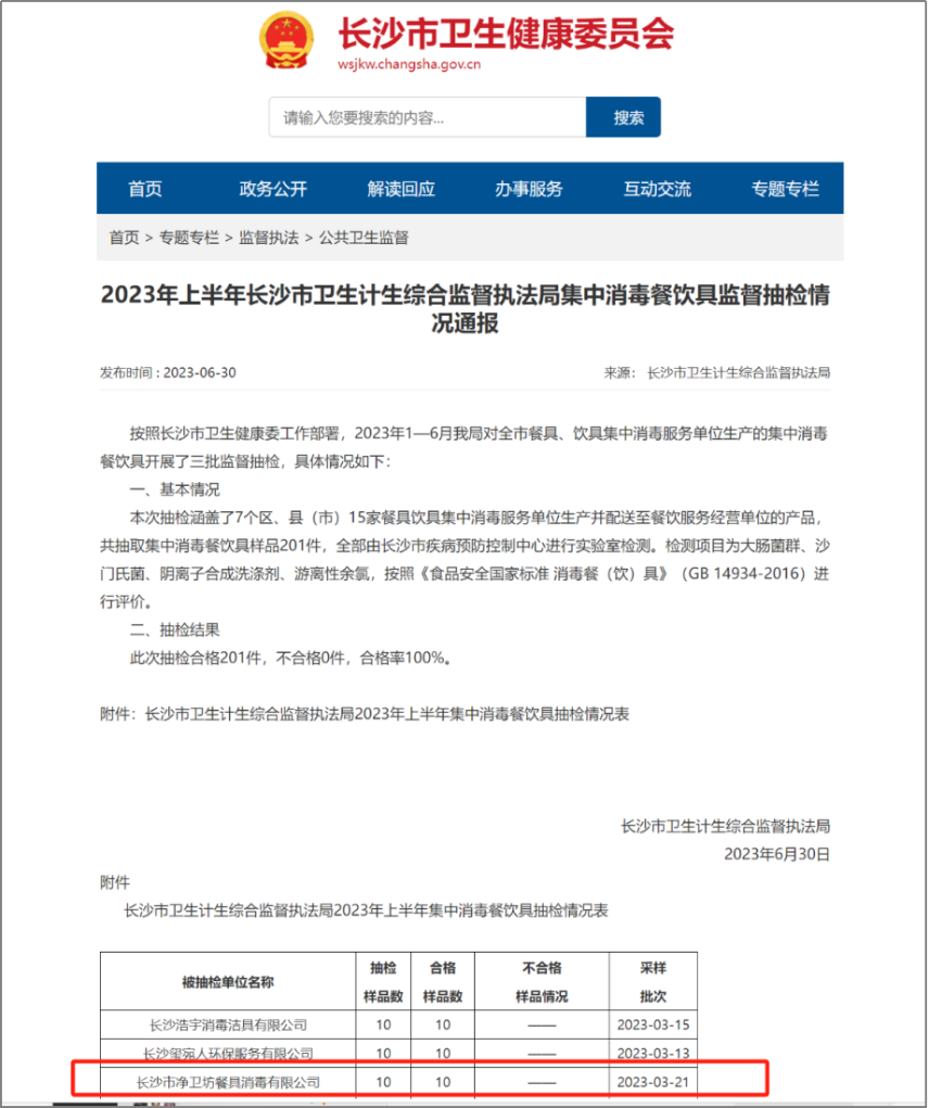 长沙市卫生计生综合监督执法局2023年6月30日公布的“2023上半年集中消毒餐饮具监督抽检情况通报”显示,“净卫坊”10件样品合格率为100%。