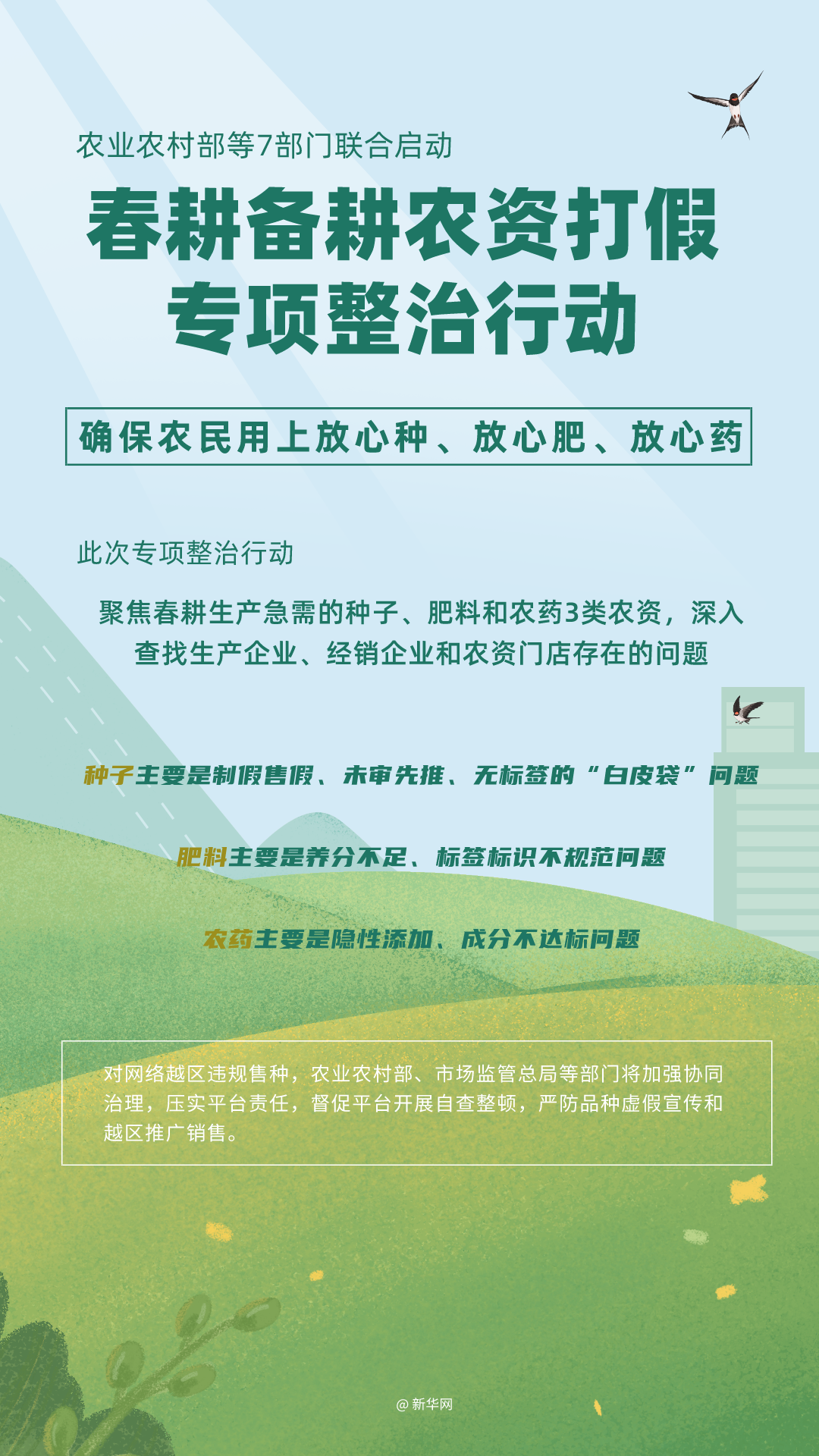 日前,农业农村部等7部门也联合启动了春耕备耕农资打假专项整治行动,采取切实措施,确保农民用上放心种、放心肥、放心药。