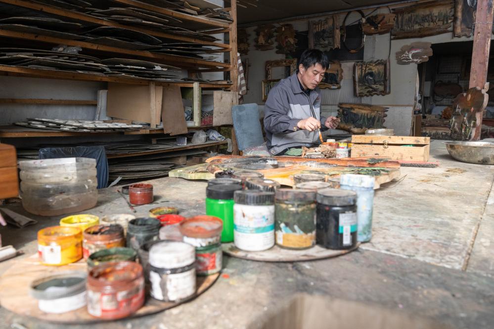 在伊春市乌翠区,手艺人李德文对木拼画部件进行上色(2024年3月14日摄)。今年48岁的李德文是一名“林三代”,现任伊春市美江木艺有限责任公司生产部经理,主要负责木雕创作和木拼画制作。