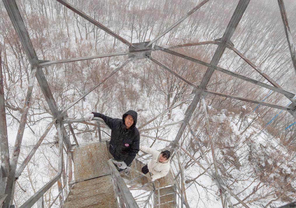 2023年3月23日,在中国龙江森工集团沾河林业局有限公司施业区,王刘洋(左)和徐盼在向彩芹瞭望塔塔顶的瞭望室攀登。