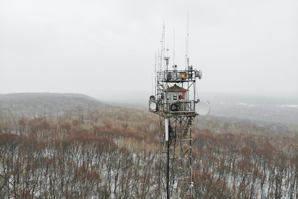 这是2023年3月23日拍摄的位于中国龙江森工集团沾河林业局有限公司施业区内的彩芹瞭望塔和塔顶的瞭望室。森林防火瞭望员常年在这里瞭望火情。