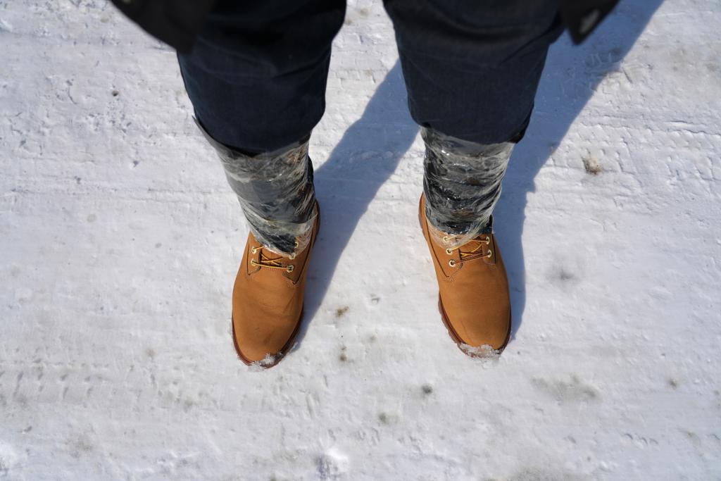 为了防止雪倒灌,记者用塑料袋和胶带打起了绑腿。