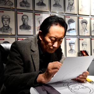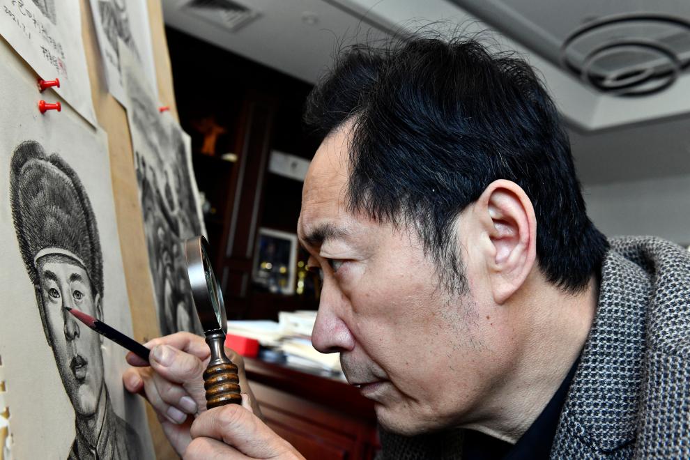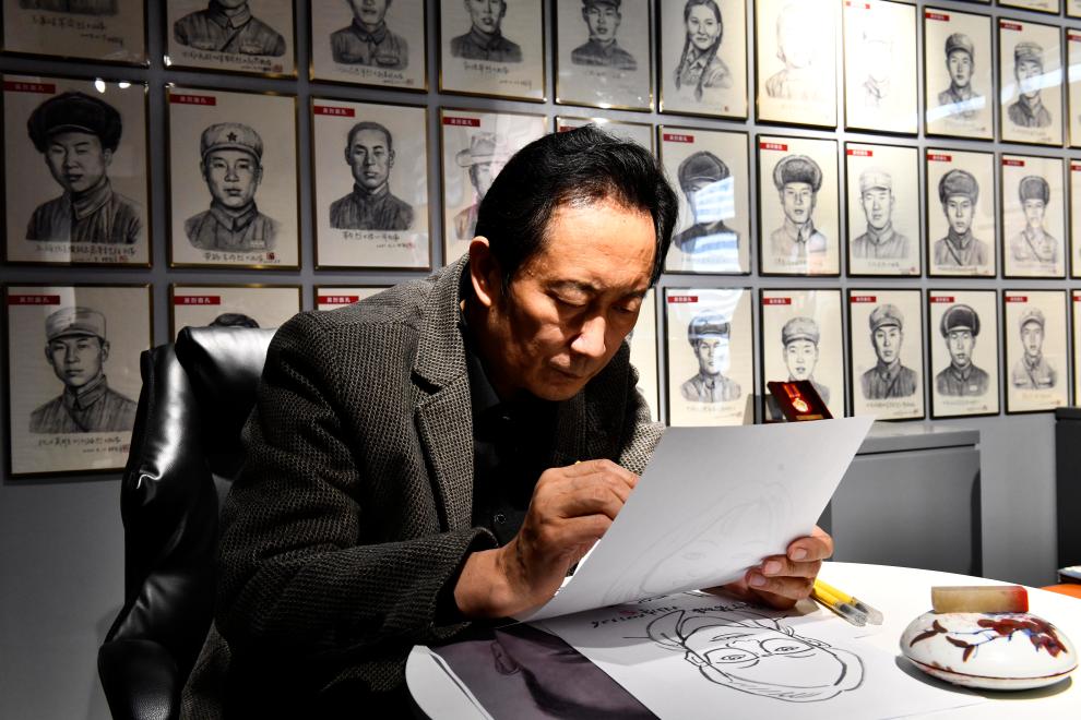2023年3月28日,林宇辉在工作室为烈士画像。新华社记者郭绪雷 摄