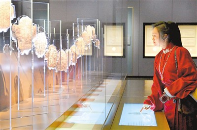 参观者在河南安阳殷墟博物馆新馆内观看展出的刻辞卜甲。新华社记者 李 安摄