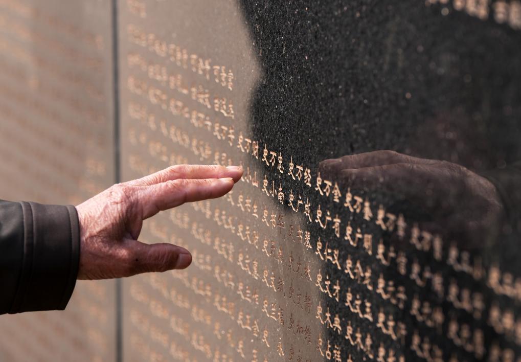 4月3日,在沈阳抗美援朝烈士陵园,史荣升老人手指轻触刻有父亲名字的烈士英名墙。 新华社记者 李钢 摄