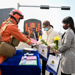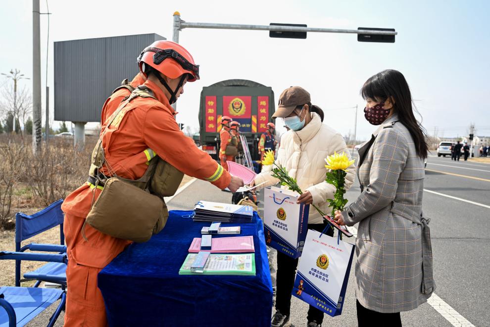 4月4日,在呼和浩特市104省道旁,内蒙古森林消防总队特勤大队指战员(左一)向进入林区的市民发放防火宣传材料。新华社记者 贝赫 摄