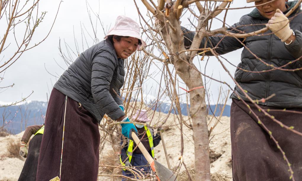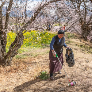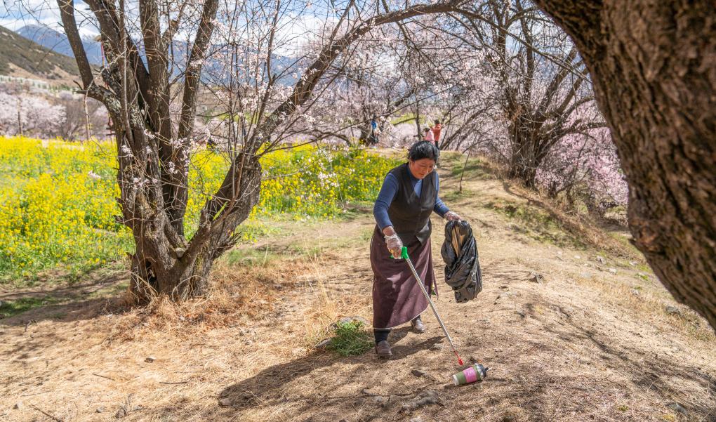 尼玛曲吉在嘎拉村桃花园里捡拾垃圾(4月1日摄)。新华社记者 丁增尼达 摄