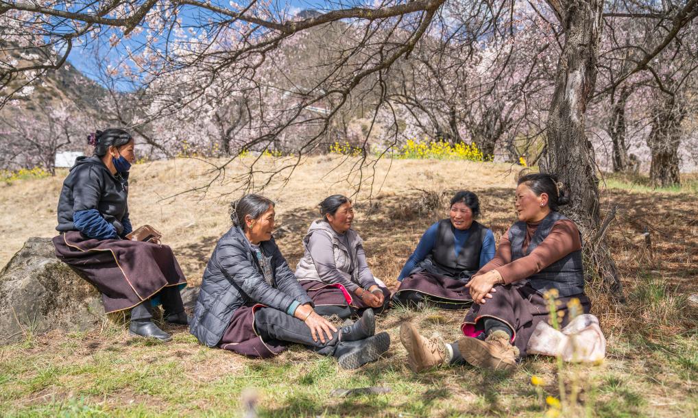 午休时,尼玛曲吉(右二)与村民在桃树下聊天(4月1日摄)。新华社记者 丁增尼达 摄