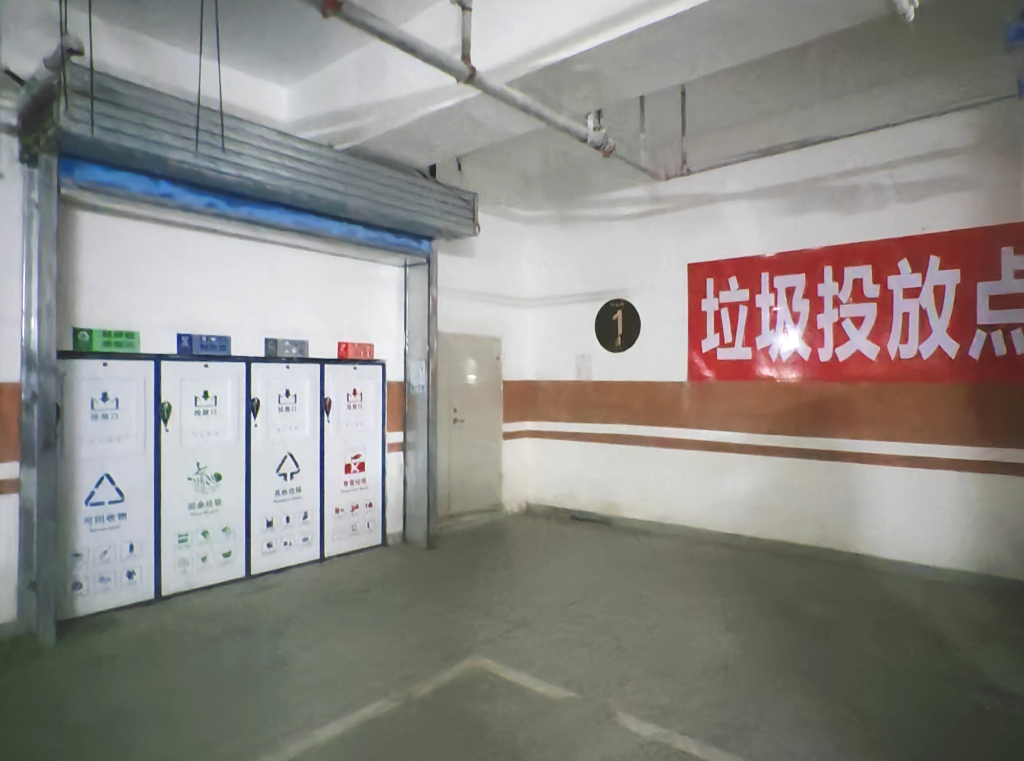 树华园小区里没有地面垃圾桶,只在一些日常人流密集区域设置有果皮箱和垃圾回收机。小区共有36栋住宅楼,按照每三到五栋楼为一个组团,在地下停车场集中设置了垃圾分类投放点。