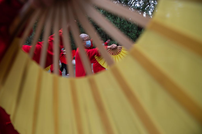 2020年8月19日,学员在北京天坛公园练习太极功夫扇。