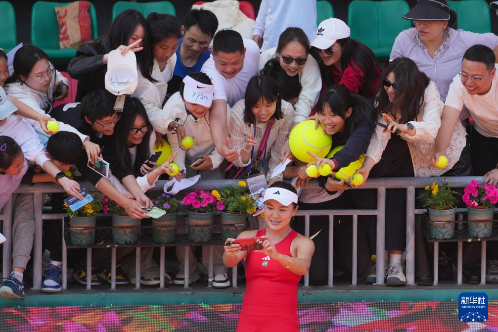 4月12日,中国队选手朱琳(下)在单打比赛后与观众合影。她2比0战胜太平洋大洋洲联队选手舒斯特。新华社记者 薛宇舸 摄
