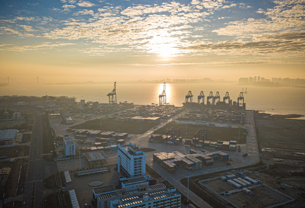 在海南自贸港重点园区——洋浦经济开发区拍摄的洋浦国际集装箱码头(2024年1月1日摄,无人机照片)。新华社记者 蒲晓旭 摄