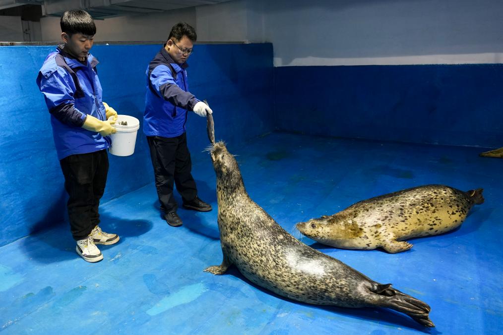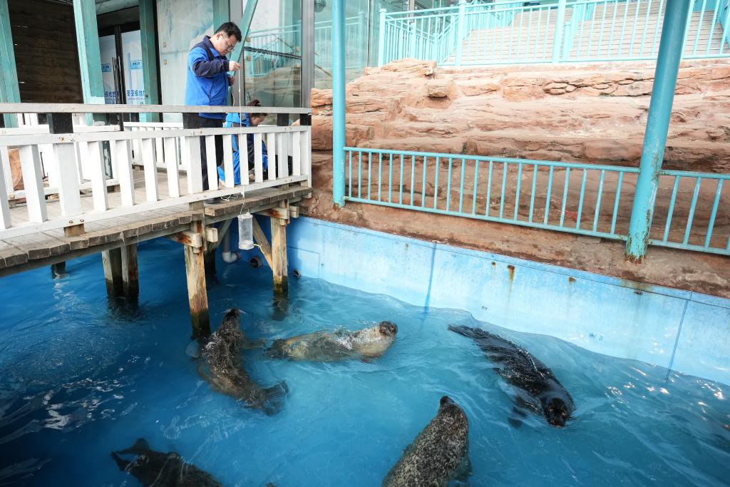 期间工作人员每天需要为斑海豹妈妈和幼崽